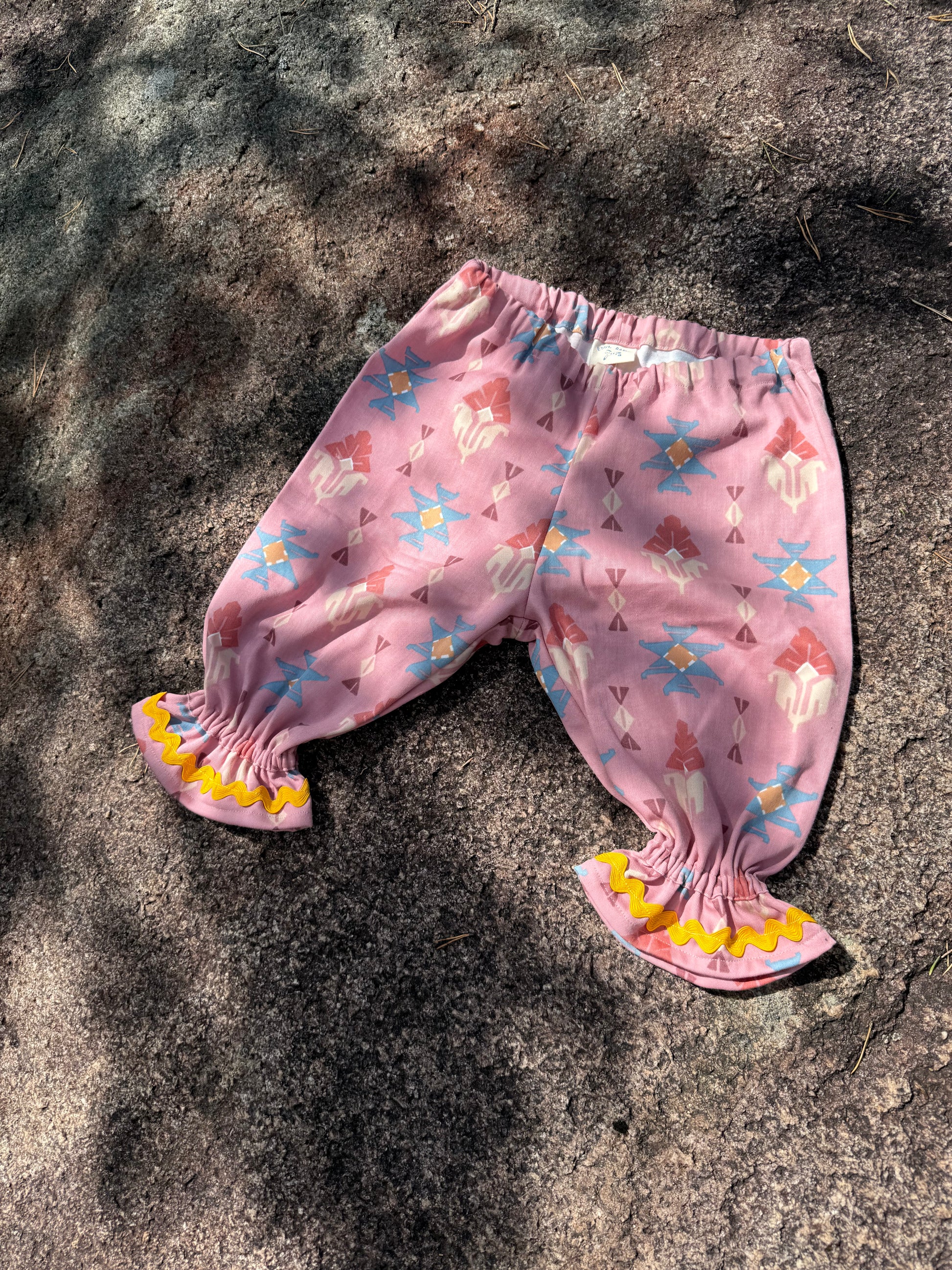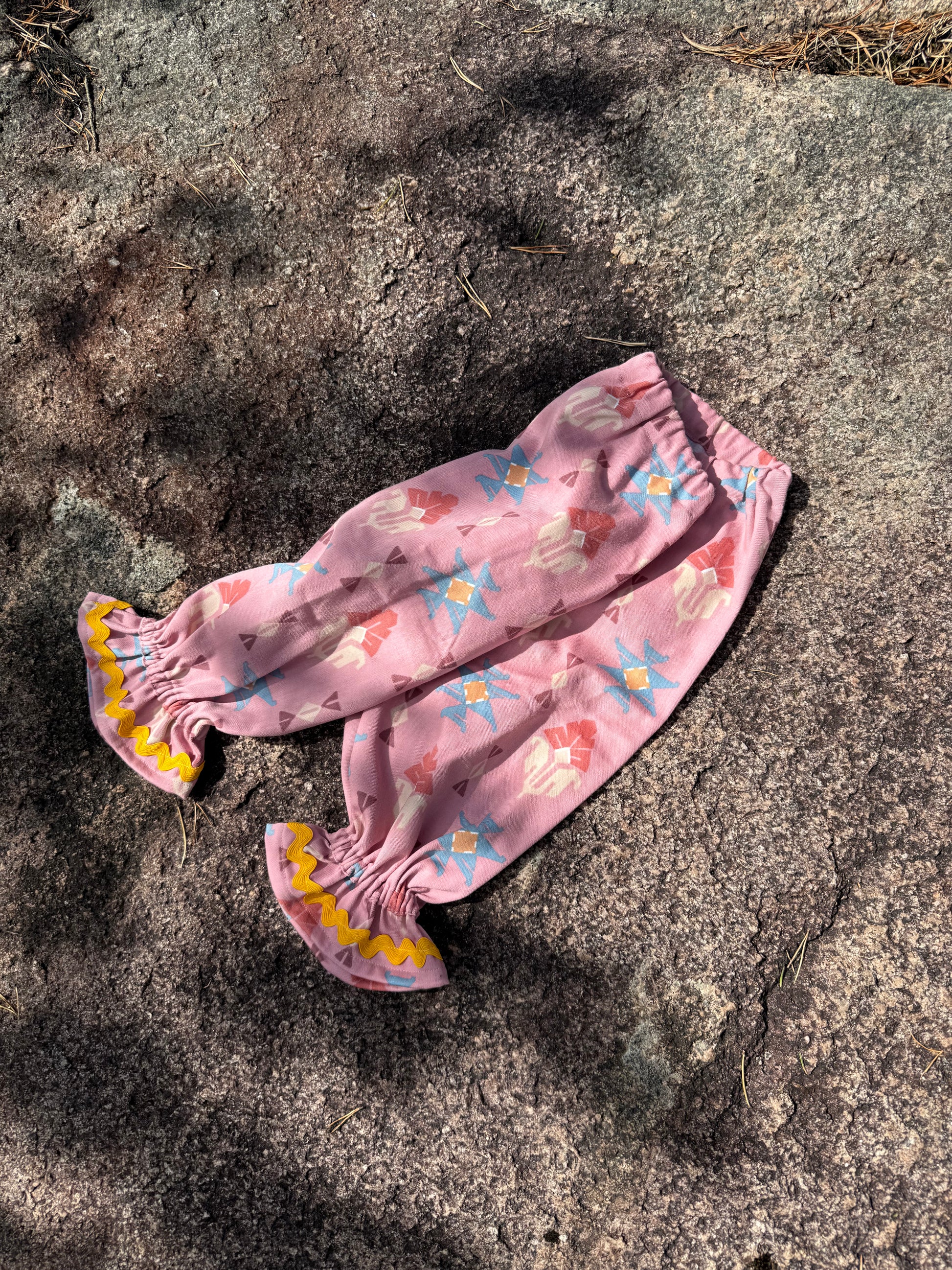 Bukse i deilig myk bomullskvalitet fra Sandvika veveri med mønster på rosa bunn. Strikk i livet og rundt ankelen. Gult sikksakk-pyntebånd. Tåler krabbing.