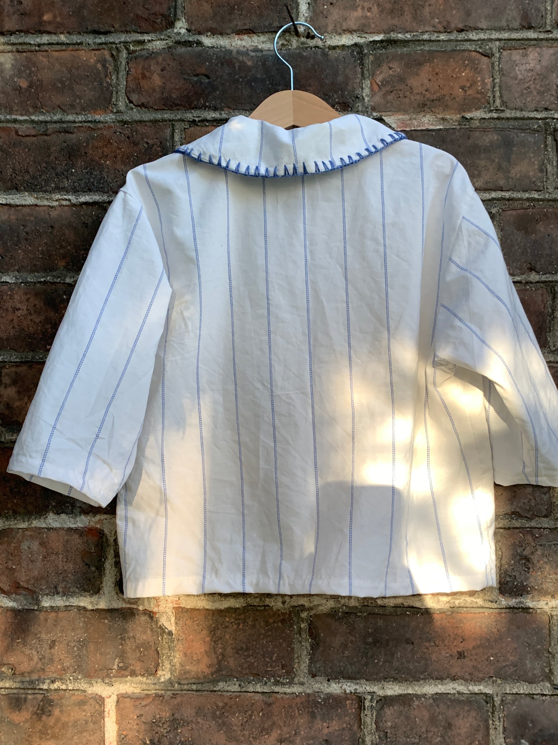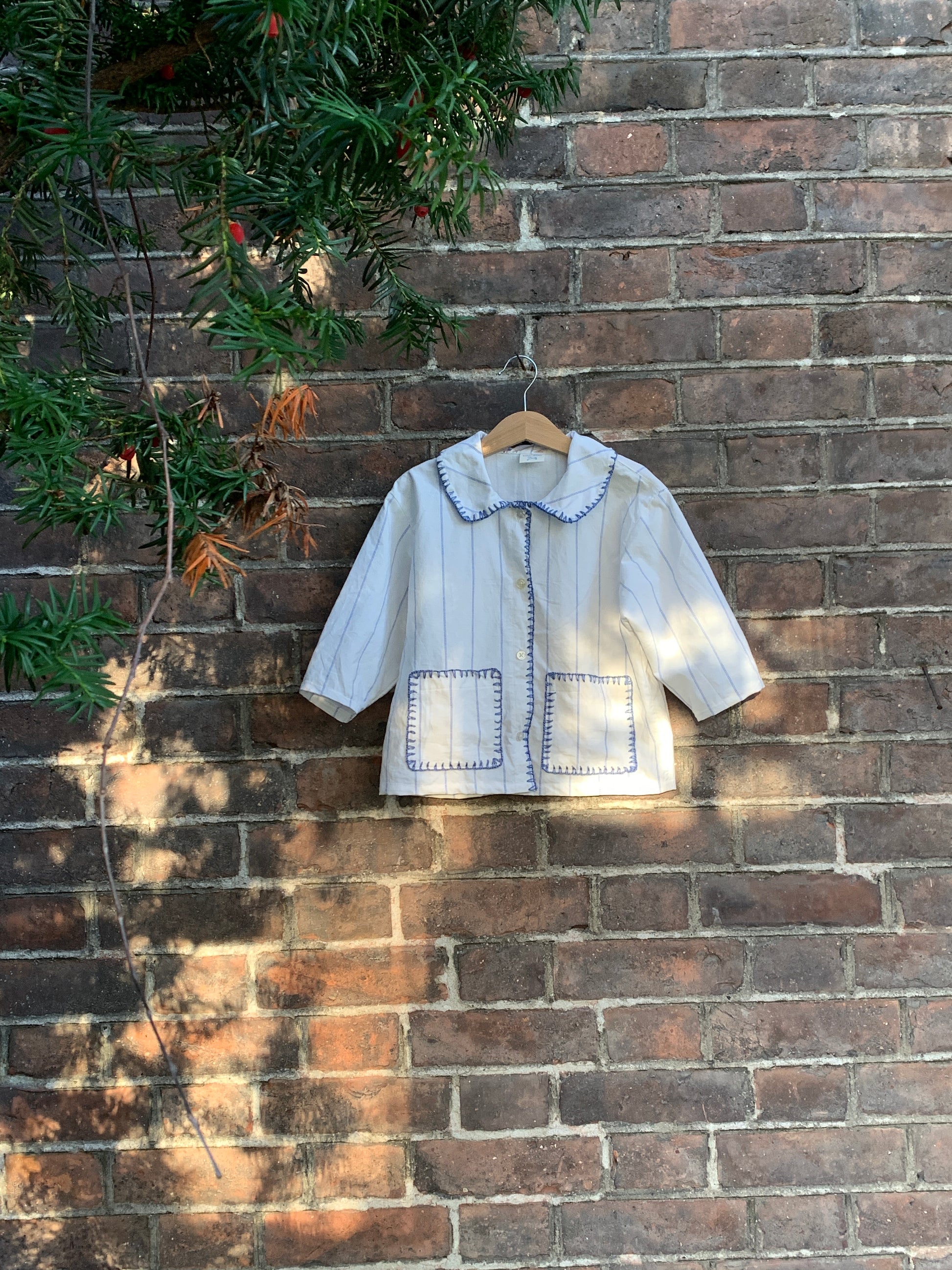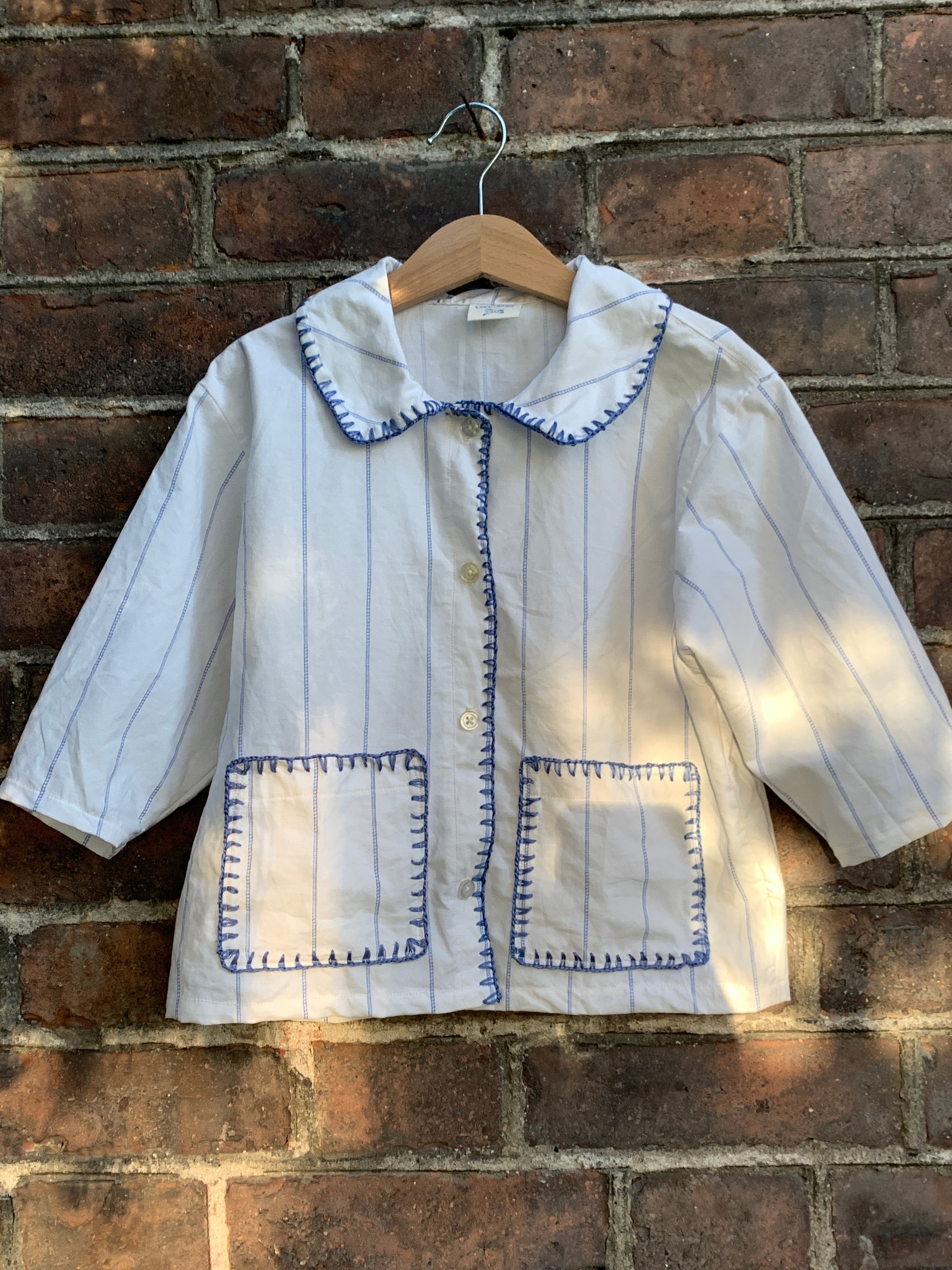 Skjorte sydd av gjenbrukt bomullstoff med blå striper. Heklet kant for hånd. Vintage knapper.