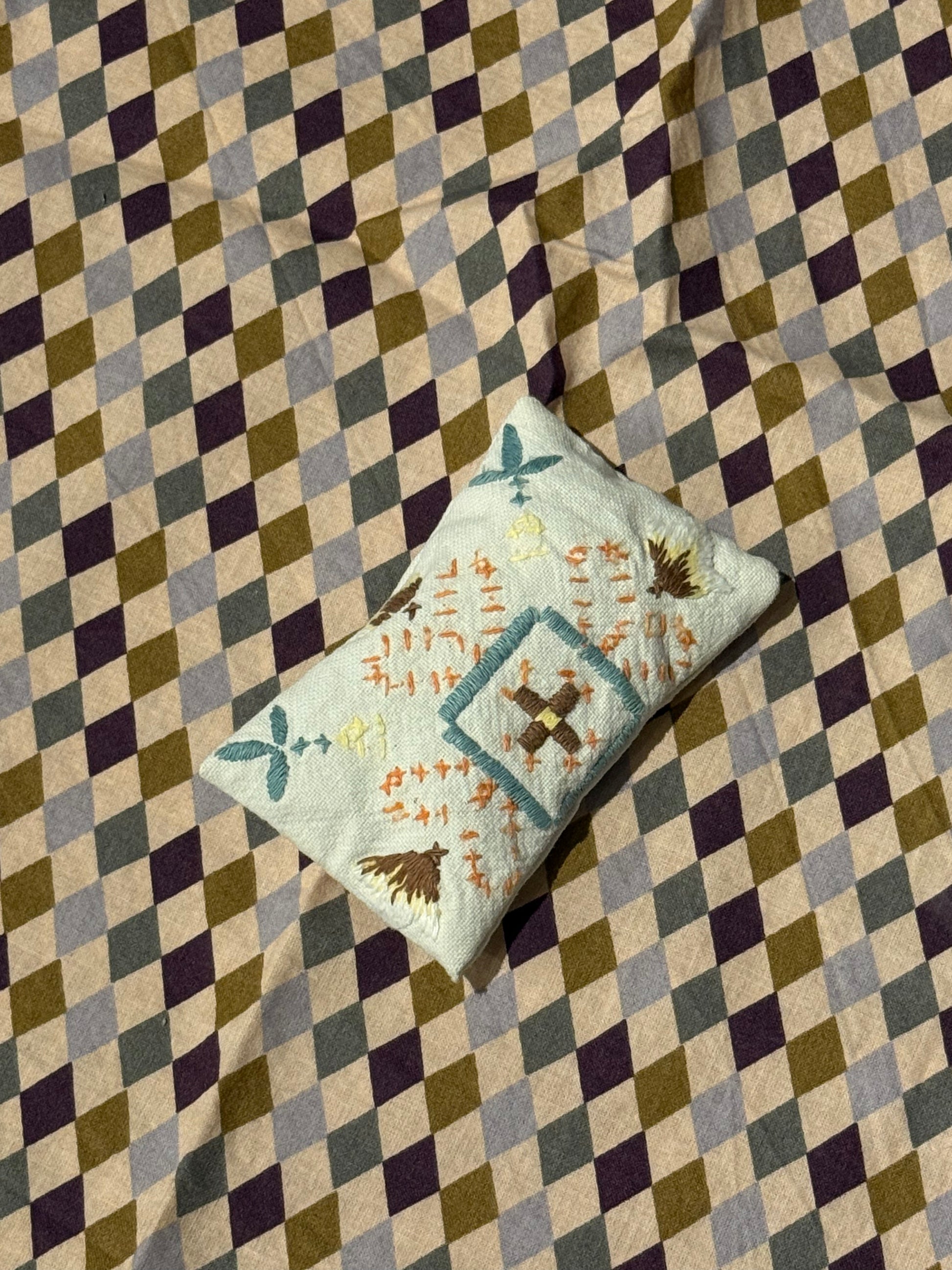 Lavendelpose sydd av tykt linaktig stoff med broderier og fylt med økologisk lavendel. Gir god duft i klesskapet og holder møllen unna.