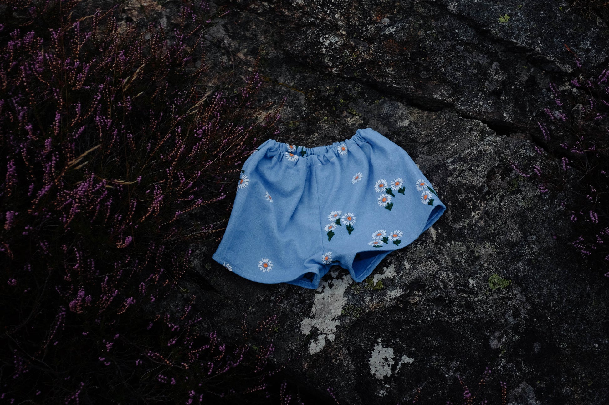 Shorts sydd av en nydelig blå duk i litt tykt bomullsstoff med broderte prestekrager. Strikk i livet.