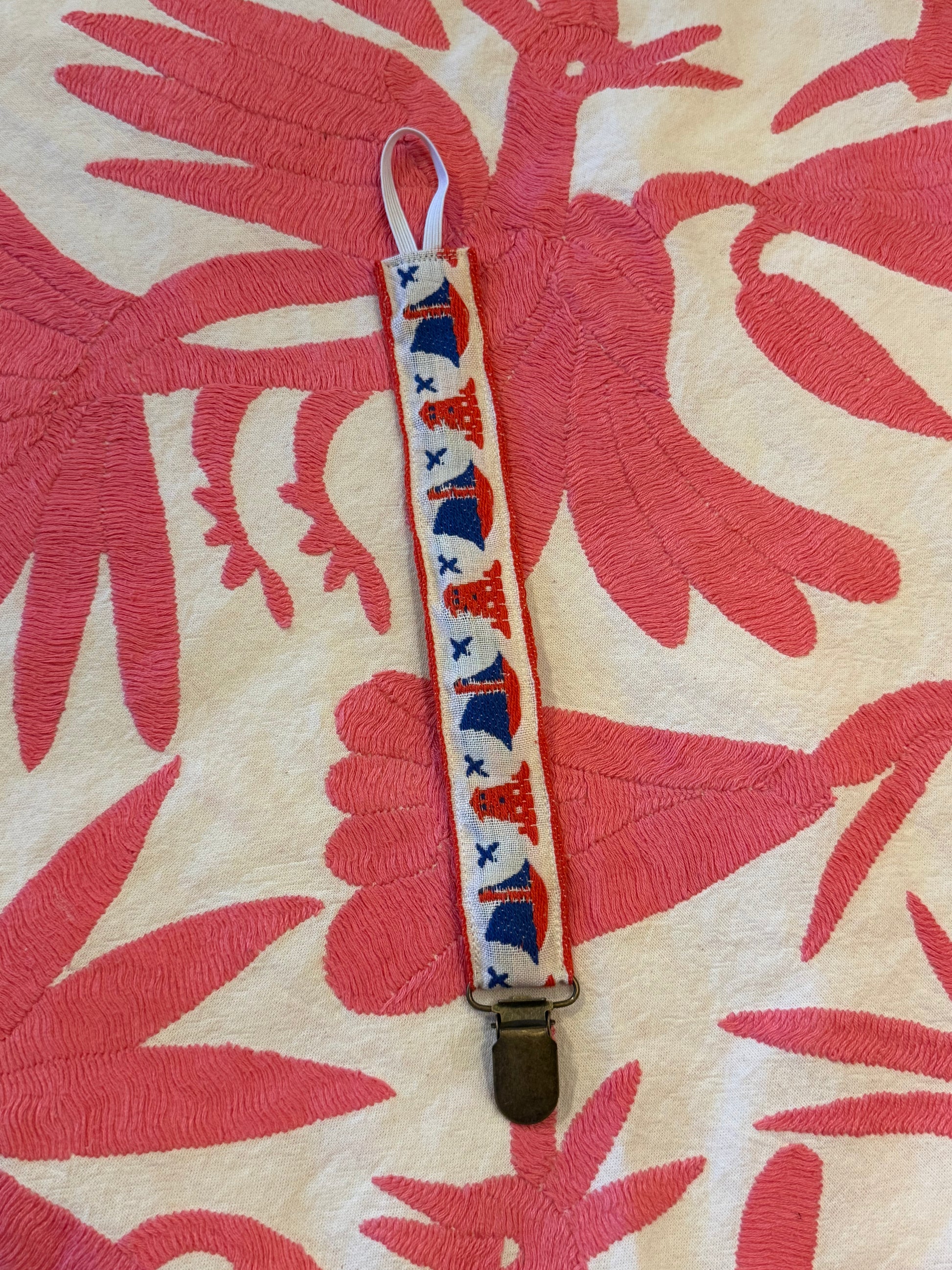 Smokkesnor sydd av vintage bånd fra New York med klype til å feste til plagg og strikk til å feste smokk.