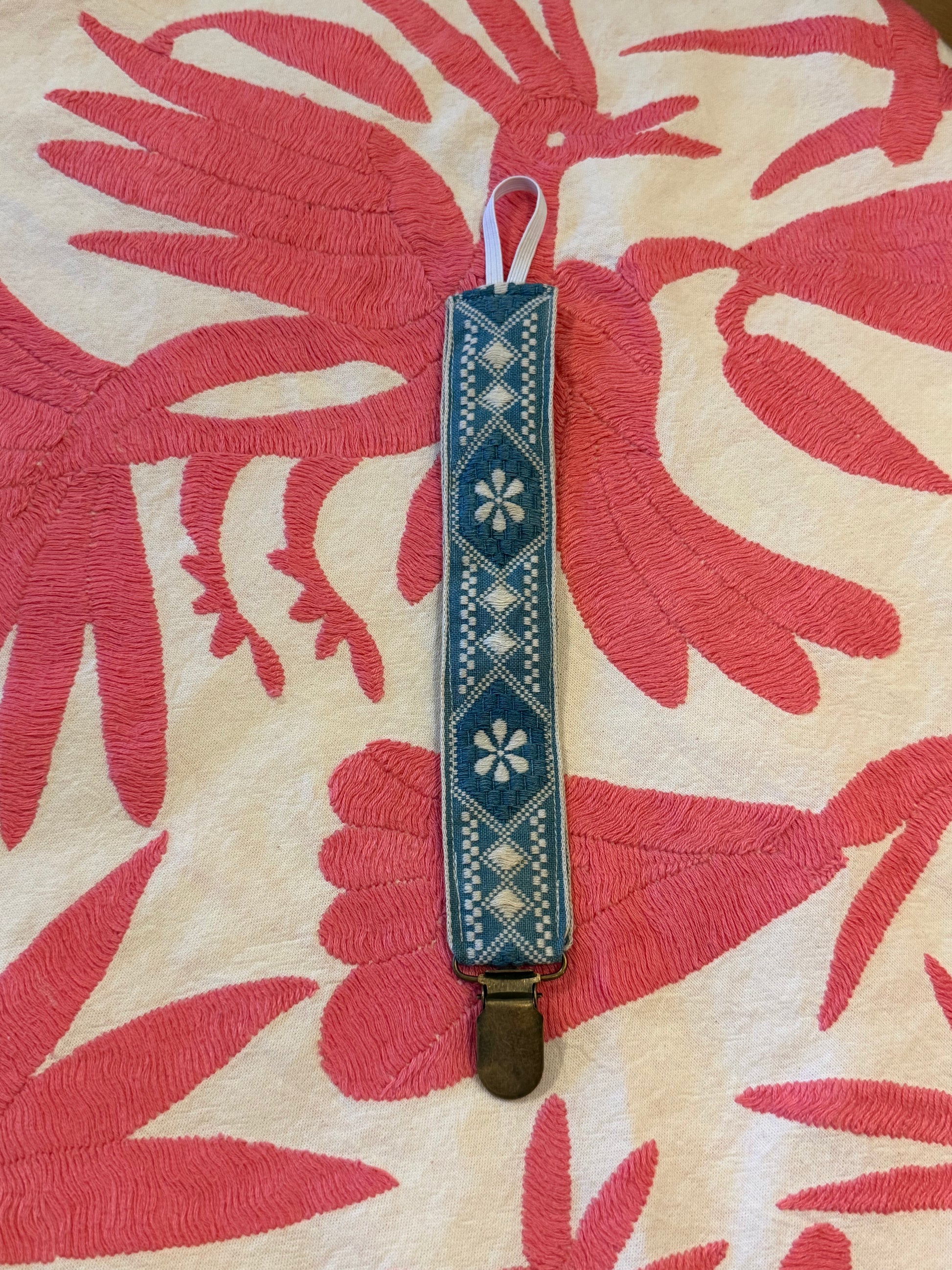 Smokkesnor sydd av vintage bånd med klype til å feste til plagg og strikk til å feste smokk.