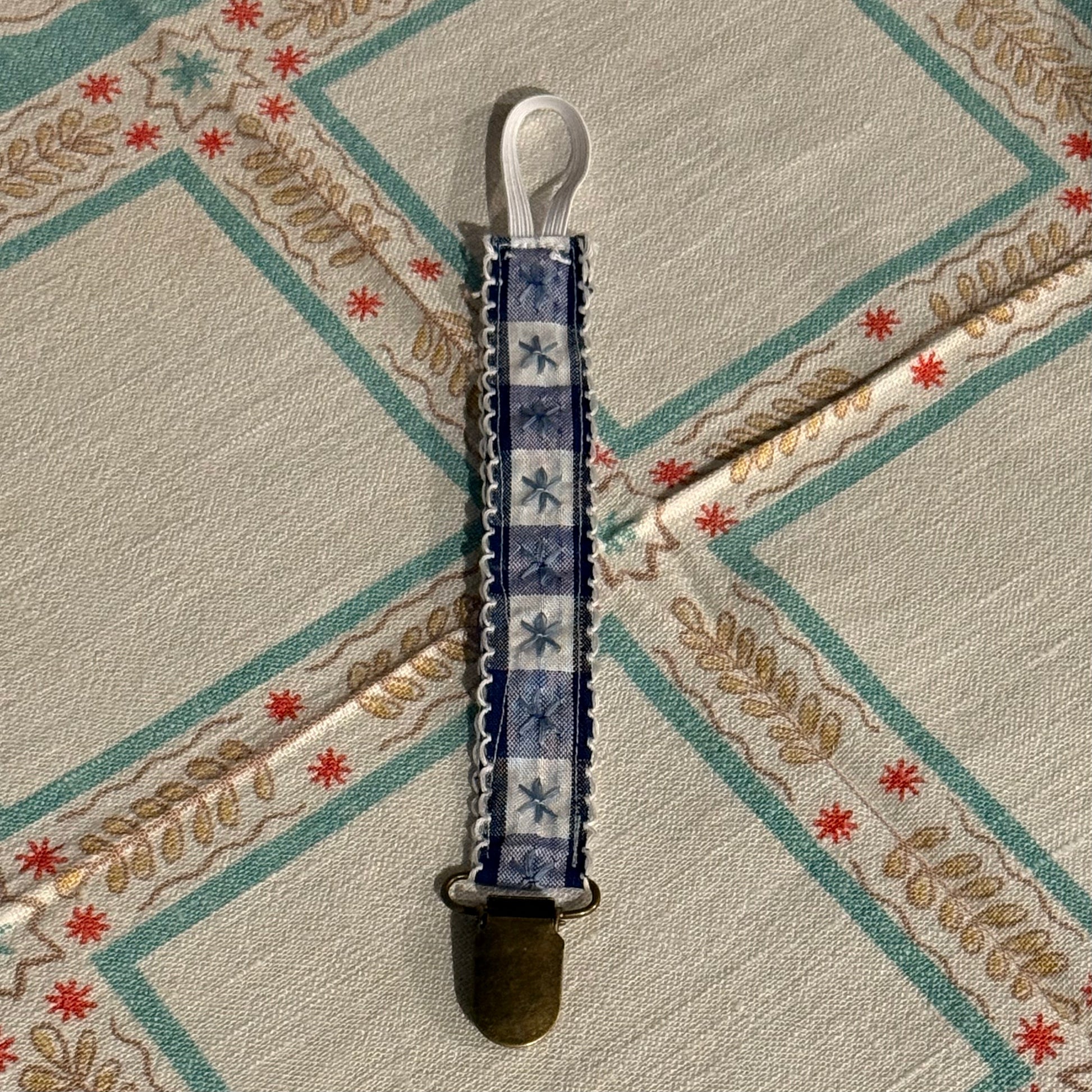 Smokkesnor med klype til å feste til plagg og strikk til å feste smokk.
