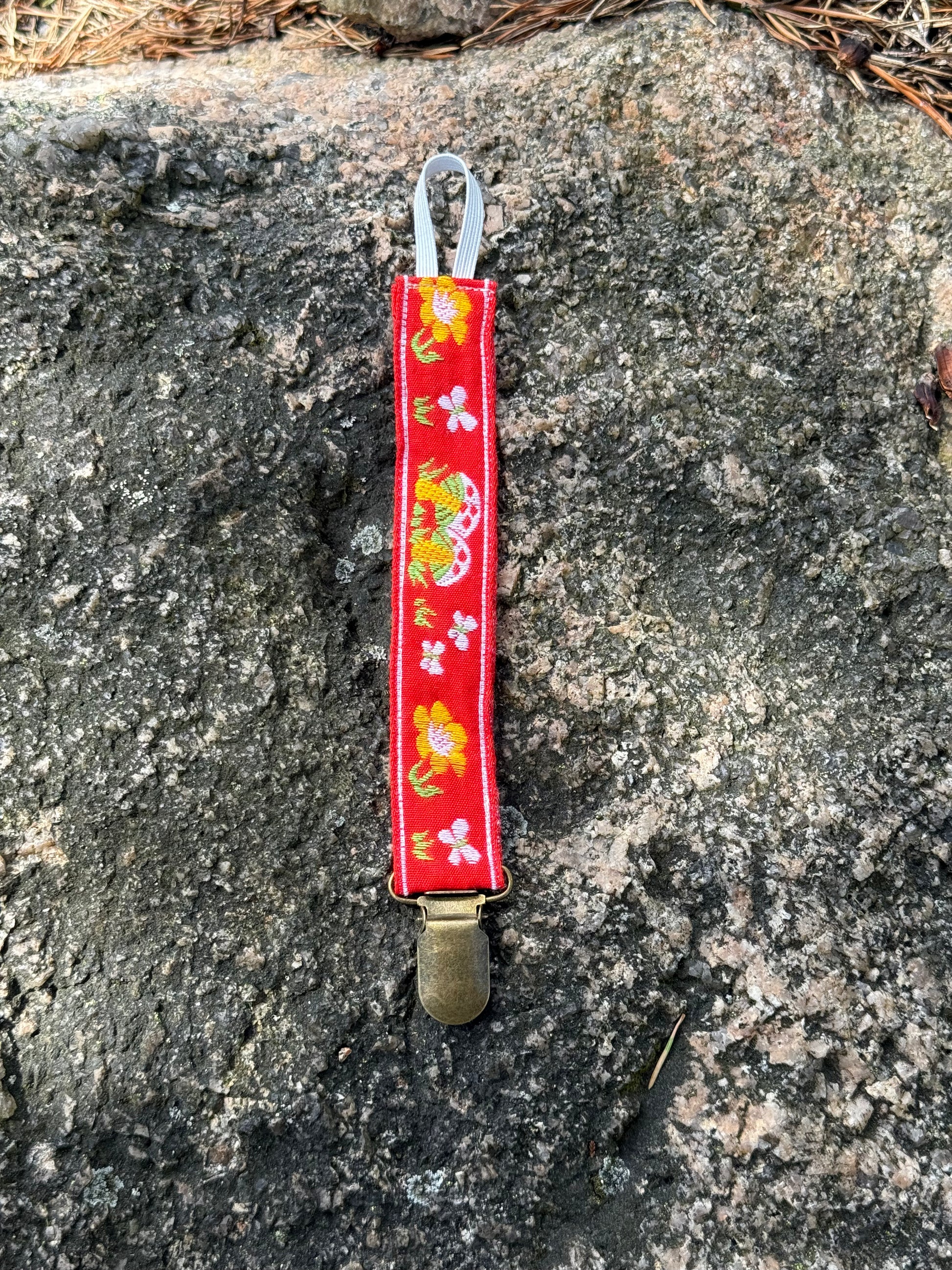 Smokkesnor med klype til å feste til plagg og strikk til å feste smokk.